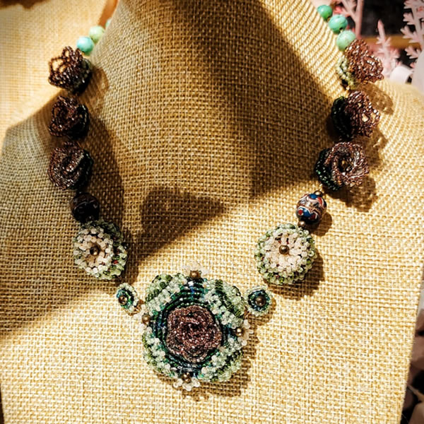 Painted wooden beads echo ancient civilizations, while a strand of turquoise graces the neckline—bringing balance, earthiness, and the richness of nature.